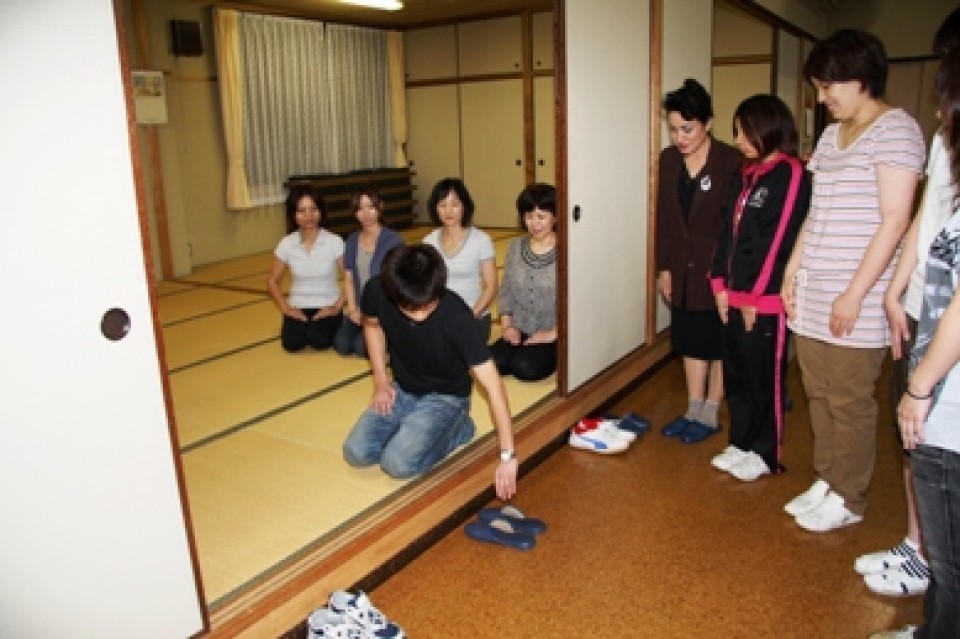 いずみの園では7年前から、「マナー向上委員会」が中心となり、職員のマナー向上を目指して、外部の講師を招き、「小笠原流礼法マナー教室」を行っています。 講師は中津市内在住の小笠原流礼法の福成綾清先生で、「初級コース」「中級コース」「お茶コース」があります。各コース半年間、全6回で行われています。 今回は「初級コース」の3日目が9月6日(火)夜にあり、新人職員を中心に基本的な礼儀作法について、座学、実技を交えて行われました。 その内容は、「玄関の上がり方、お座敷での礼の作法について」で、参加した10名は日頃と違い、緊張して福成先生の指導を受けました。 ご利用者に対して温かい福祉の心があっても、介護の知識や技術が優れていても、マナーが無いと相手に通じないものです。どんな場所(場面)に出ても、一流人、社会人として通用するマナーを身に付けて欲しいものです。