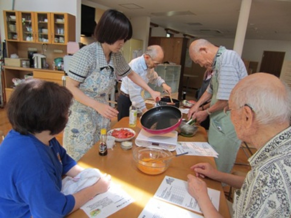 8月26日(金)、法人の経営する戸建有料老人ホーム 『シニアレジデンスいずみの森』でクッキング教室を行いました。 『いずみの森』(全8戸、入所者10名)では2ヶ月に1回(今年度は偶数月)にクッキング教室を行っています。 『いずみの園』の管理栄養士と一緒に、旬の素材を使い、ご家庭でも簡単に出来る料理を調理し、試食を行います。 今回は6名の方が参加し、夏野菜(トマト・ゴーヤ・きゅうり)を使って「トマトと卵の中華炒め」「ゴーヤの佃煮」「おろしきゅうりの甘酢そうめん」の3品を作りました。最近では、男性入居者の参加も増え、クッキングを楽しんでいます。 このクッキング教室は、『いずみの森』のご利用者だけでなく、地域の方もお気軽に参加していただけたらと考えておりますので、参加ご希望の方がいらっしゃいましたら、『いずみの森』までご連絡下さい。参加費が材料費の実費として400円かかりますので、予めご了承ください。 |
