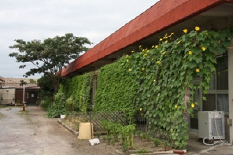 電力需要量が懸念されている昨今ですが、いずみの園でも夏の省エネ対策を行っています。 特養めぐみ館の横にゴーヤと糸瓜のグリーンカーテンを作っています。庶務係の脇本さん、橋本さんが4月に苗を植え、精魂こめて育て、今では窓いっぱいを覆うくらいです。 このグリーンカーテンにより、建物の温度上昇が抑えられ、エアコンの節電が出来ています。 今日(8月5日)の朝には黄色い糸瓜の花も咲きました。 これからゴーヤの実もたくさん採れることでしょう。