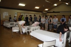 8月3日(水)、地域交流ホームいずみ館で、特養事業部勉強会を行いました。 この勉強会は特養事業部の全職員を対象に、月に1回行われ、介護の技術力の向上、ケアの質の向上を目的に行われています。 今回は前半に「口腔ケア」について、ビデオ学習とリハビリ課の江利歯科衛生士による講義を行い、後半にベッドのシーツ交換のロールプレイングを行いました。