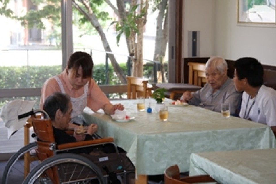 7月15日(金)午後、いずみの園(特養)きぼう館のご利用者と開業したてのレストラン「ベエルシバ」でティータイムを楽しみました。 ご利用者の方はケーキを食べられ、木漏れ日を見ながら、いつもと違った雰囲気の中、ゆっくりと味わっていただきました。 |