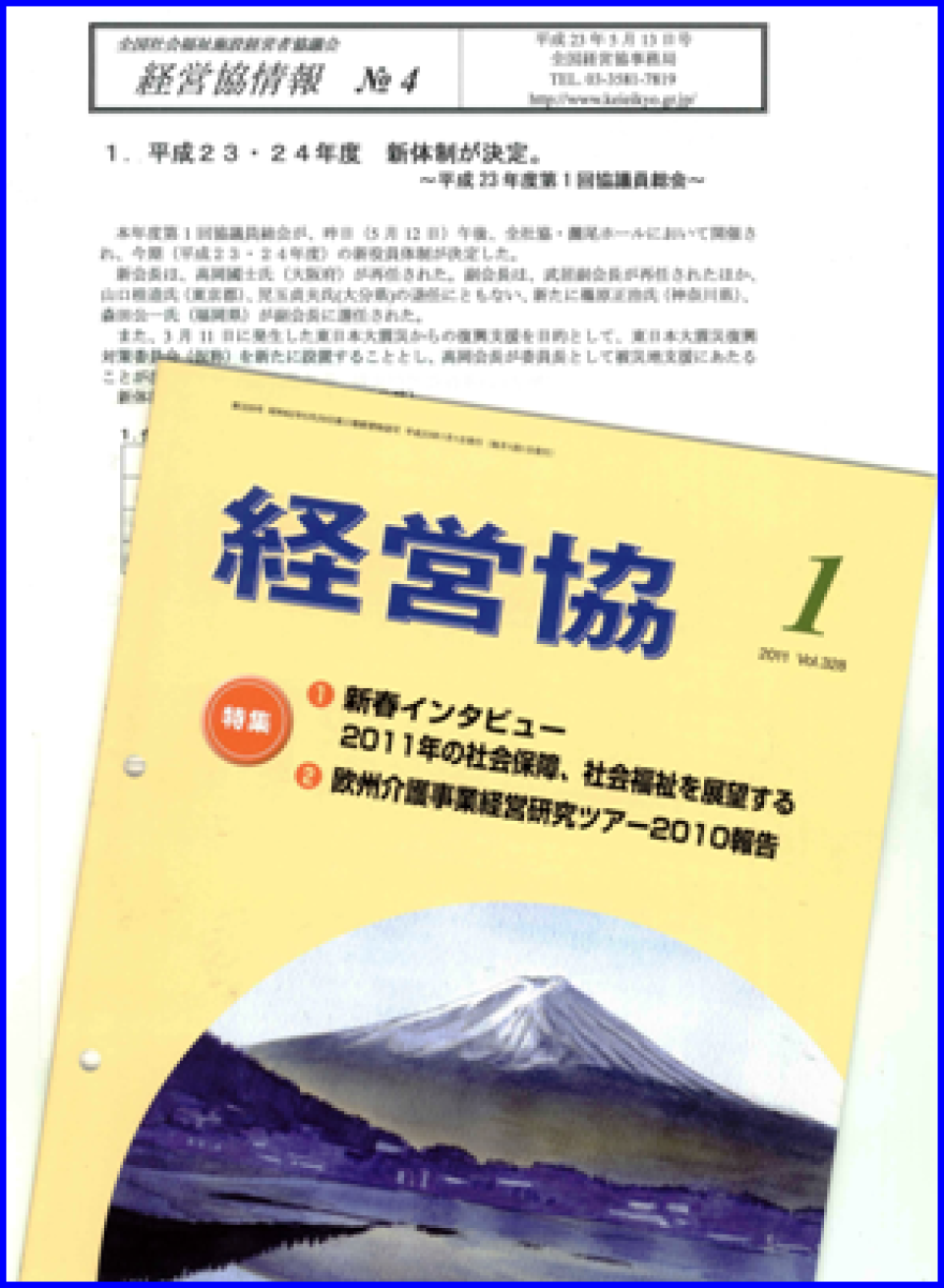 これは全国経営協の2011、2012年度新体制の決定によるもので、今後、施設事業経営者の中央団体として、介護保険施設等の職員研修、月刊情報誌発行(写真)、電子媒体による「経営協情報」、経営面からの現状や分析を厚労省等関係方面へ提言していくことになります。
