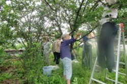 頼りになる男性入居者が上の実を取ってくれ、女性職員が枝にしがみつき木をゆすり、下では女性入居者が手の届く限り取ったり、受けてくれたりとみんなで大いに汗をかいてがんばりました。