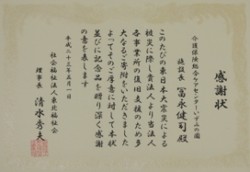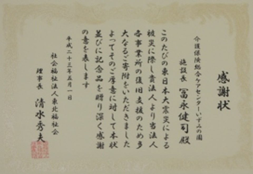 東日本大震災の被災地への支援に対し、社会福祉法人東北福祉会より感謝状をいただきました 2011.06.15