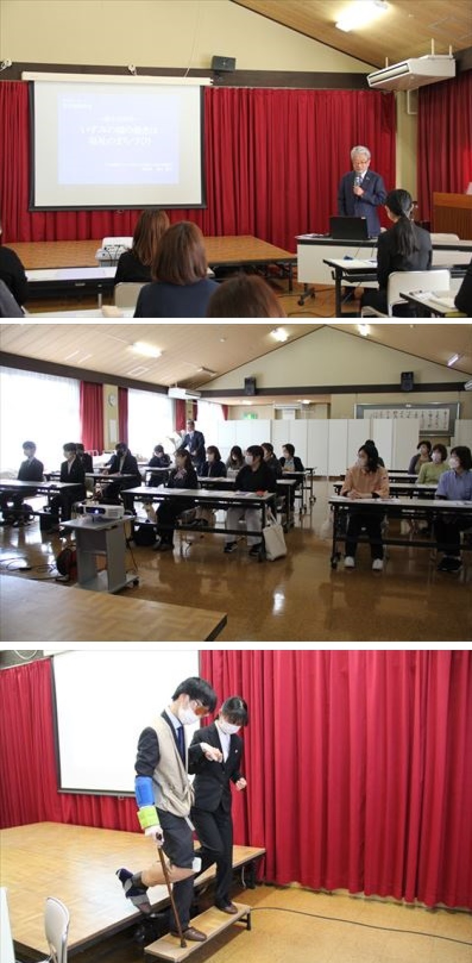 (写真上・中:理事長の講話) (写真下:高齢者疑似体験の様子)