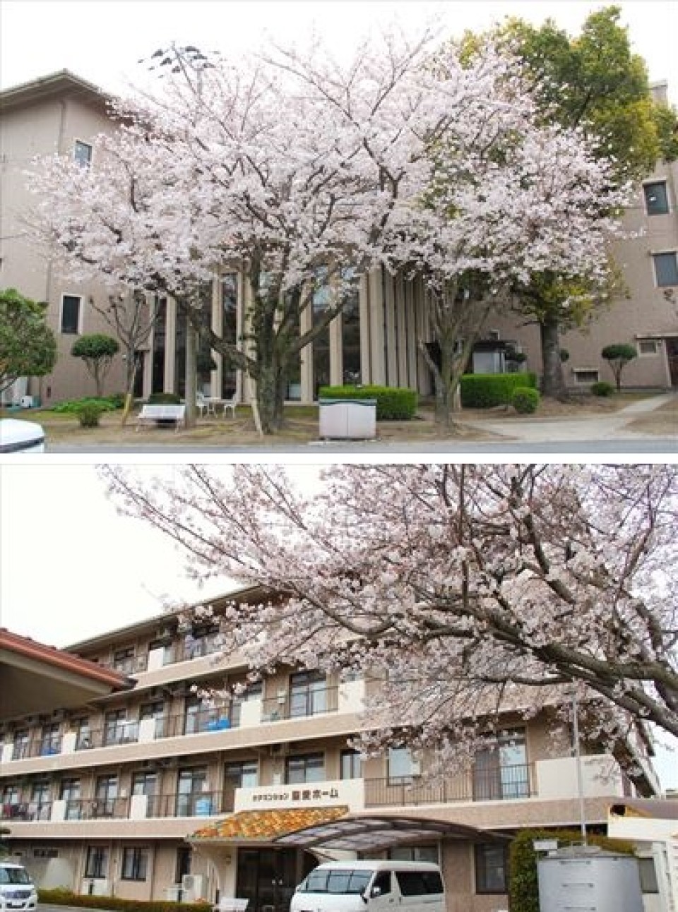 (写真上:お客様駐車場横の桜の木) (写真下:聖愛ホーム横の桜の木)