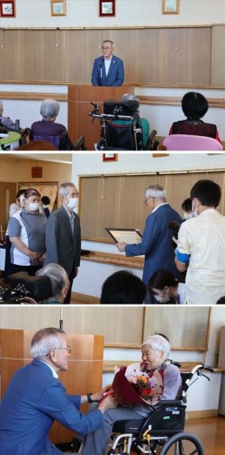 9月16日(火)敬老のお祝いに奥塚中津市長がいずみの園へ来園されました。 ケアマンション聖愛ホームの食堂に「特別養護老人ホームいずみの園」のご利用者と「ケアマンション聖愛ホーム」のご入居者が集まり、市長からお祝いの言葉をいただきました。 その後に今年、米寿の方7名と喜寿の方2名計9名のご利用者へ中津市長より寿詞と記念品が贈呈されました。さらに、特別養護老人ホームいずみの園に入所されているご利用者が、中津市内最高齢者として花束を受け取りました。