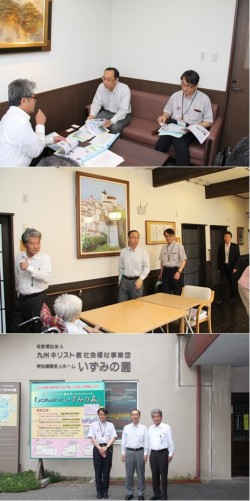 12月1日(火)に、中津市の稲田副市長と、介護長寿課課長、班長の3名が、「いずみの園」に来園されました。 はじめに、当園のミーティングルームにて「いずみの園」紹介DVDで全体を説明(写真上)、その後園内を見学されました。 見学は、「特養いずみの園」(写真中)、「ケアマンション聖愛ホーム」、24時間対応の「コールセンター」(写真下)、「シニアレジデンスいずみの森」を見られ、その後「かきぜサポートセンター」の「サマリア館」や、小規模多機能型居宅介護の「寄り合いセンターいずみ」、隣接している「かきぜグループホームけやき・いちょう」を見学されました。 稲田副市長は本年4月に現職に就任され、「これから中津市の福祉のことをもっと勉強したい。」との希望で当園を訪問されました。見学先では、冨永理事長や各部署の担当者の説明を熱心に聞かれていました。 稲田副市長、お忙しい中ご来園頂きまして、誠にありがとうございました。
