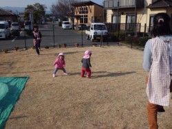事業所内保育施設「マリアガーデン」では、子どもたちの病気をしないための体作りとして、1月よりお天気のよい日は園庭で朝の体操、マラソンを実施しています。 外に出るときは防寒着を着用しませんが、体操を始めるとすぐに体がポカポカに温まります。体操を始めた最初のころは、『先生、寒いけお部屋で体操しようよ』など言っていた子どもたちですが、最近では『先生、今日は外で体操しようよ』と言ってくるようになりました。体操後のかけっこでも、何度もゴールで待っている保育士目指して、全力で走ってきてくれます。足腰も随分としっかりしてきたので、かけっこも楽しそうに参加しています。 まだまだ寒い日が続きますが、子どもたちの体調に合わせて外で体操やかけっこを実施し、病気をしない元気な体作りを行っていきます。 (マリアガーデン) |