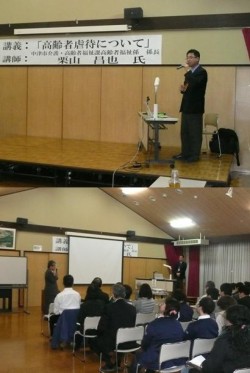 19日、定例の園内研修会が開催され、中津市福祉部介護・高齢者福祉課福祉係の栗山係長から「高齢者虐待防止について」の研修会が職員約100名参加し、18時30分から1時間半、いずみ館で行われました。 高齢者虐待防止法は2006年4月から施行されましたが、中津市においての取り組みと事例についての講習で、養護者(在宅)による虐待が多くを占めており、施設での虐待は表面化しにくく十分な実態把握が出来ていないとのこと。また、在宅での虐待の内容は 身体的虐待が多くが心理的虐待、介護放棄などに加え、認知症の一人暮らしの方は経済的虐待も通告されており、こうした情報があれば地域包括支援センターに連絡し、市の担当部局を含め、介入について難しい問題もあるが、被害が拡大しない様関係機関において、適切な対応がなされる様と努力さてていることが報告されました。