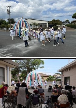 8月23日(金)いずみの園の近くにある八幡鶴市神社で鶴市花傘鉾祭が行われ、今年も永添地区の花傘鉾がいずみの園に来られました。 「鶴市花傘鉾祭事」は昔、山国川(一級河川)の井堰を完成させるために人柱となったお鶴と市太郎親子の霊を慰め、五穀豊穣を願うお祭りで、中津市の夏の恒例行事となっています。 いずみの園でも、毎年、永添地区の花傘鉾の飾りのお花をご利用者と職員で作り、協力させていただいています。今年は800個のお花を作りました。 当日は特養のご利用者も外に出て、子どもたちによる厳かなお囃子の音を聴き、ご利用者も大変喜ばれていました。 (特別養護老人ホームいずみの園)