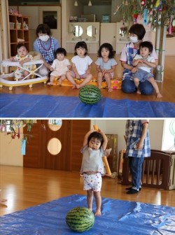 「事業所内保育施設マリアガーデン」でスイカ割りをしました。 「ケアマンション聖愛ホーム」のご利用者がいずみの園の敷地内にある畑で育てたスイカをいただきました。 園児も大きなスイカに大喜びで、一生懸命スイカを割りました。最後は、みんなでおやつの時間に食べました。
