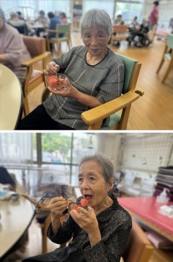 7月22日(月)「デイサービスセンターふれんど館」の畑で収穫したスイカを召し上がっていただきました。 5月に植えたスイカが収穫時期時になったのでご利用者の皆様と食べました。採れたてのスイカは、「甘くておいしい!」と大好評です。 まだまだ、出来ているので収穫していきたいと思います。