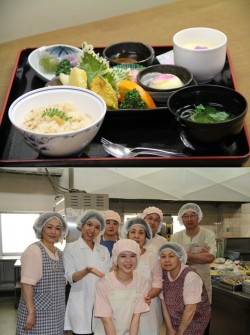 「いずみの園」では月に一度、特別養護老人ホームとショートステイのご利用者へ、誕生会食の提供を行っています。 5月は17日(木)の昼食が誕生会食でメニューは、 竹の子ご飯 天ぷら盛り合せ 紅白なます 茶碗蒸し 菖蒲まんじゅう 水まんじゅう 吸い物 でした。(写真上) ご利用者の皆様からは、「美味しい」、「お御馳走をありがとう」という声が聞かれました。栄養課と日清医療食品(株)の栄養士、調理スタッフ(写真下)で、日々のお食事から行事食まで、ご利用者の皆様に安全で美味しい食事をお届けできるように努力しています。 (栄養課) |