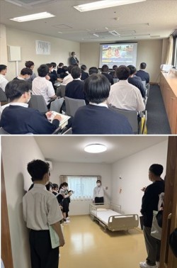 5月28日(火)大分市にある「智泉福祉製菓専門学校」の1年生23名と先生2名が「いずみの園」へ見学に来られました。 まず、当園の施設の紹介動画を見ていただきました。その後に施設見学を行い、「特別養護老人ホームいずみの園ヨハネ館・ショートステイ」のご利用者の暮らしや見守りシステムなどを紹介いたしました。 また、他にも「ケアマンション聖愛ホーム」「デイサービスセンターふれんど館」「リハビリセンターふれあい館」を見学しました。