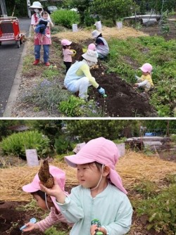 「事業所内保育施設マリアガーデン」でじゃがいも掘り体験をしました。いずみの園の敷地内に畑があり、「ケアマンション聖愛ホーム」のご利用者が様々な野菜を作っています。 今年もご利用者より声を掛けていただき、子どもたちと職員でじゃがいも堀り体験をさせていただきました。子どもたちは沢山のじゃがいもに驚きながら、楽しそうに収穫することができました。