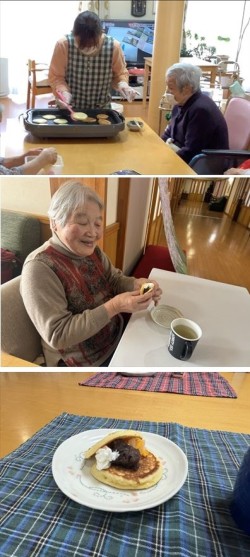 3月7日(木)「特別養護老人ホームいずみの園ヨハネ館」でどら焼きを作りました。 どら焼きは生地から作り、栗や餡子を挟んで出来立てを召し上がっていただきました。ご利用者より「これは美味しい!」と大好評でした。